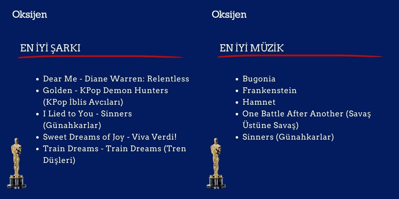 Şarkı kategorisinde herkes Kpop İblis Avcıları’nın şarkısı “Golden”ı bekliyor merakla. Bakalım sahnede nasıl bir performans verecek kızlar. Müzik kategorisinin en güçlü adayı ise “Sinners”. Filmde müzik ana karakterlerden biri adeta. Sonraki ihtimal zayıf ama “Savaş Üstüne Savaş”.
