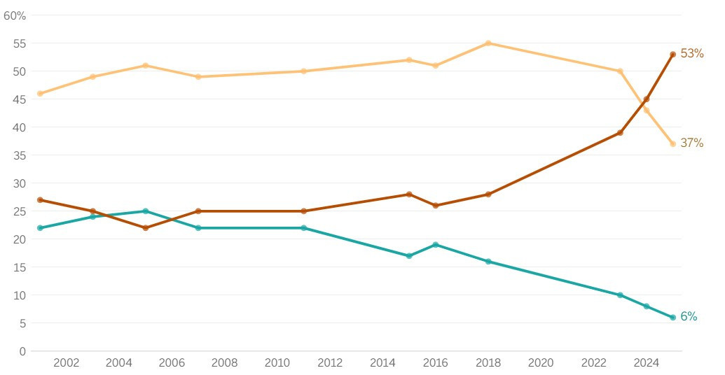 Alkolün sağlık riskleri hakkındaki endişeler, tüketim oranlarına da yansıyor. Ankete katılanların yalnızca yüzde 54’ü alkol tükettiğini söylüyor. Bu, Gallup’un son 30 yıldaki en düşük oranı. Genç yetişkinler, kadınlar ve bazı orta yaş gruplarında düşüş daha belirgin.