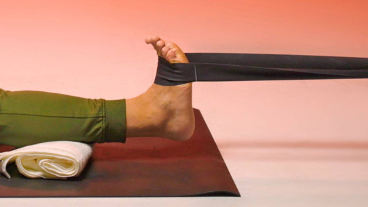 Direnç bandı yere yakın, sabit bir noktaya-örneğin ağır bir dambıl veya koltuk ayağına sabitleniyor. Yere oturup baldırın altına rulo yapılmış bir havlu yerleştiriliyor. Band, ayağın üst kısmına geçirilip geriliyor.
