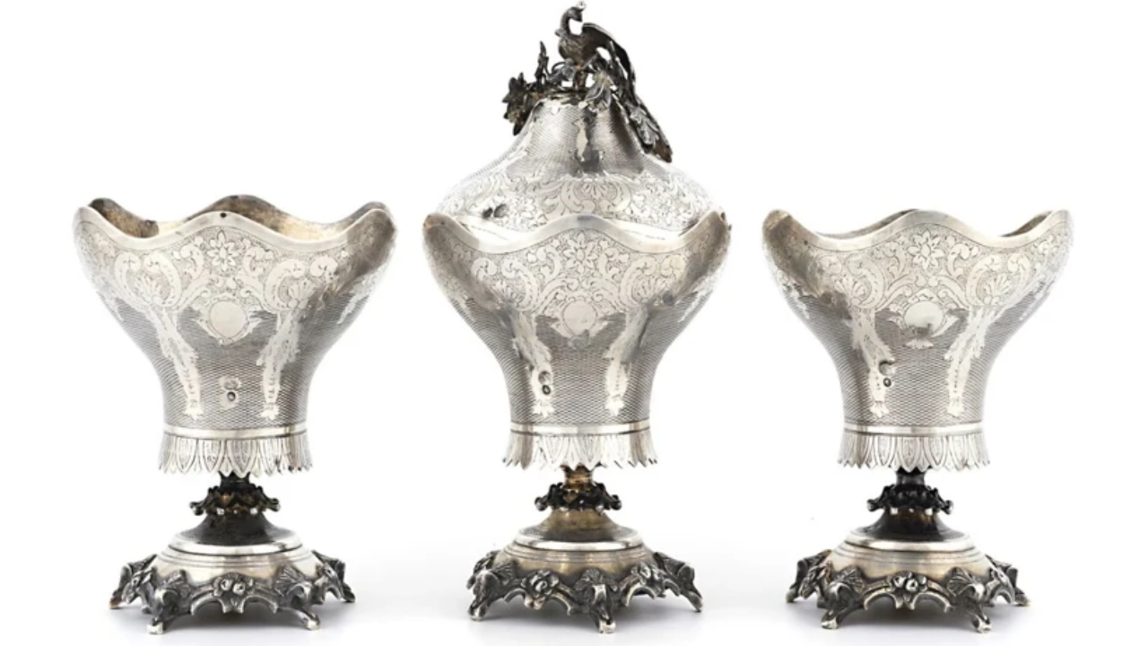Aynı müzayedede Osmanlı saray estetiğinin en seçkin örneklerinden biri olarak kabul edilen II. Abdülhamid tuğralı gümüş servis takımı da var. Tam takım olarak bugüne ulaşan eser; çift kaşıklık, bir tatlılık ve altı şerbet kadehinden oluşuyor. Osmanlı Rokokosu üslubunda tasarlanan eserin yüzeyinde üst düzey işçilikle uygulanan guilloché, grave ve kalemişi süsleme teknikleri bulunuyor. 1 dolar açılış fiyatıyla açık artırmaya çıkan takım için verilen pey miktarı 6 bin 500 doları buluyor.
