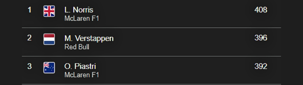 Şu an puan tablosunda McLaren pilotu Lando Norris 408 puanla lider. Red Bull’dan Verstappen 396 puanla onu takip ediyor. McLaren’ın diğer pilotu Oscar Piastri ise 392 puanda. Son yarış öncesi tablo net Verstappen Abu Dabi’de kazanır ve Norris podyuma çıkamazsa, Hollandalı pilot üst üste beşinci şampiyonluğunu alacak ve McLaren’a spor tarihinin en büyük çöküşlerinden birini yaşatmış olacak.