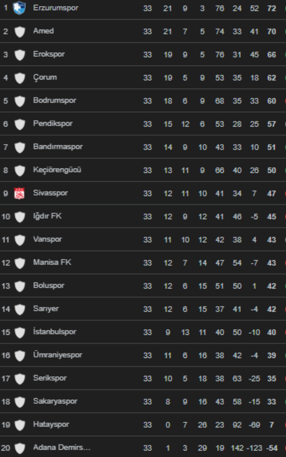 TFF 1. Lig puan durumu