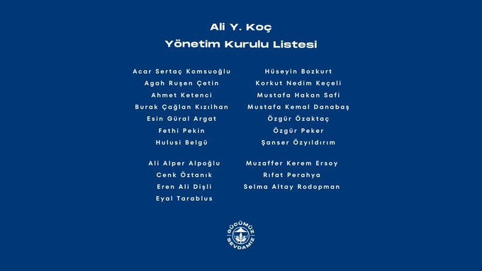 Fenerbahçe Kulübünde eylül ayında gerçekleştirilecek seçimli olağanüstü genel kurulda başkan adayı olan mevcut başkan Ali Koç'un yönetim kurulu listesi belli oldu. Ali Koç'un kampanya sayfasının X hesabından yapılan açıklamaya göre, Fenerbahçe Yüksek Divan Kuruluna teslim edilen aday listesinde şu isimler yer alıyor: