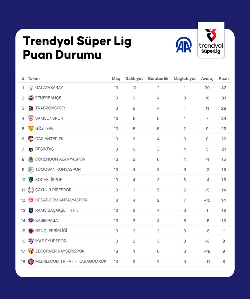 Süper Lig'de haftanın kapanış gününde Konyaspor ile Antalyaspor golsüz berabere kaldı. Trabzonspor ise Başakşehir'in büyük bölümünü 10 kişi oynadığı karşılaşmada deplasmanda rakibini 4-3 yendi. Haftaya Fenerbahçe'nin 1 puan önünde lider giren Galatasaray, konuk ettiği Gençlerbirliği'ni 3-2 ile geçerken, takipçisi Fenerbahçe ise Rize deplasmanından 5-2 galip ayrıldı. Sezonun 13. haftasının sonuçları, puan durumu ve 14. haftanın programı şöyle: