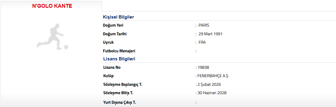 Fenerbahçe, Fransız futbolcu N'Golo Kante'yle 2,5 yıllık anlaşma yapıldığını TFF'ye bildirdi. Türkiye Futbol Federasyonunda (TFF) yer alan lisans bilgilerine göre sarı-lacivertli kulüp, Fransız futbolcuyla 2,5 yıllık sözleşme yaptı.