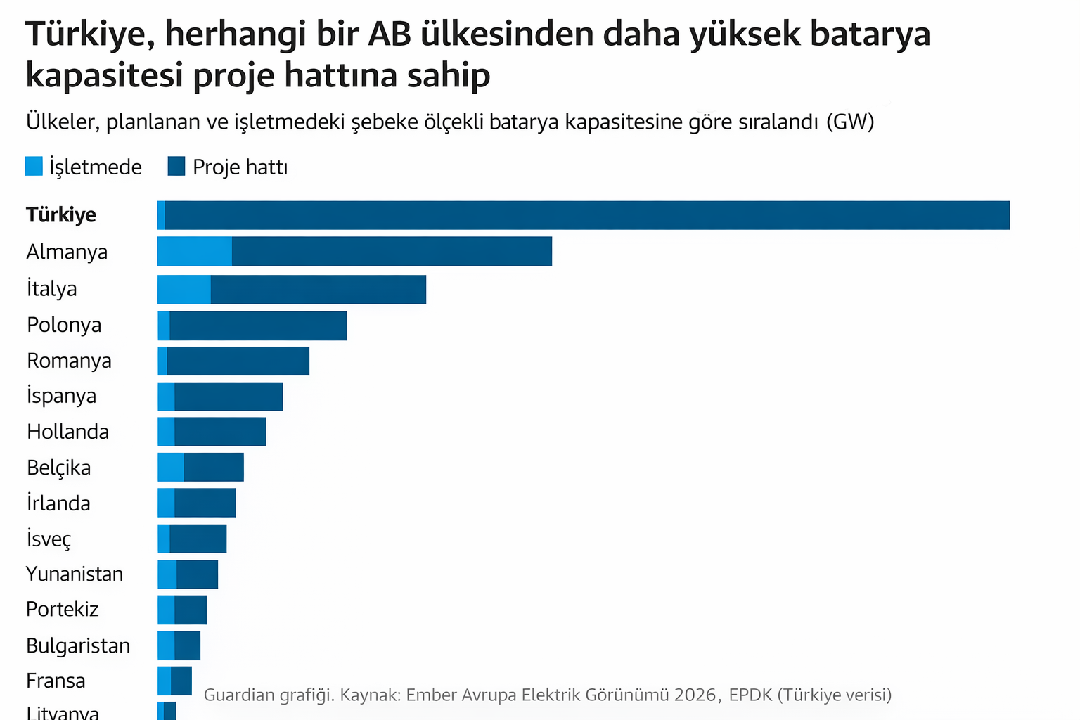 The Guardian’ın Avrupa çevre muhabiri Ajit Niranjan’ın, iklim düşünce kuruluşu Ember verilerine dayandırdığı haberine göre Türkiye, 2022’den bu yana onaylanan batarya depolama kapasitesinde AB üyesi ülkelerin tamamını geride bıraktı. Türkiye’de onaylanan kapasite 33 GW’ı aşarken, bu rakam batarya yatırımlarında öne çıkan Almanya ve İtalya’da toplam 12-13 GW seviyesinde kaldı.