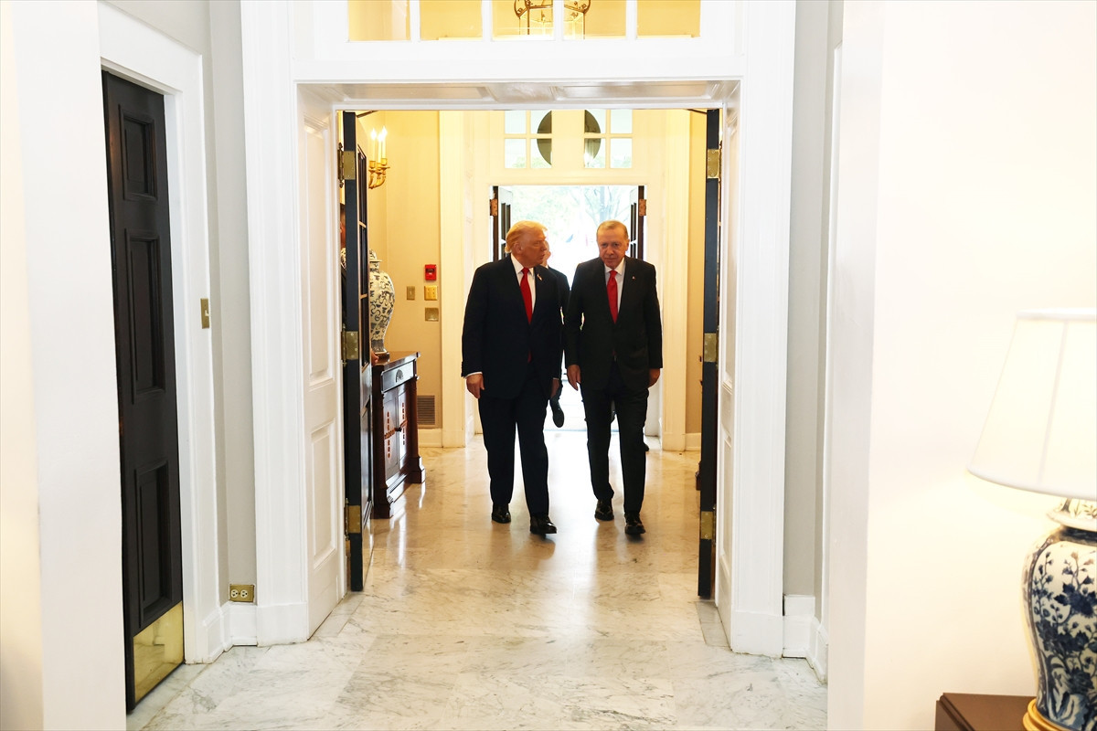 Cumhurbaşkanı Erdoğan'ın konakladığı Blair House'dan ayrılarak geldiği Beyaz Saray'ın bahçesinde, tören kıtası hazır bulundu. Makam aracından inişinde ABD Başkanı Trump ile tokalaşarak gazetecileri selamlayan Erdoğan, daha sonra Trump'la birlikte içeri girdi.