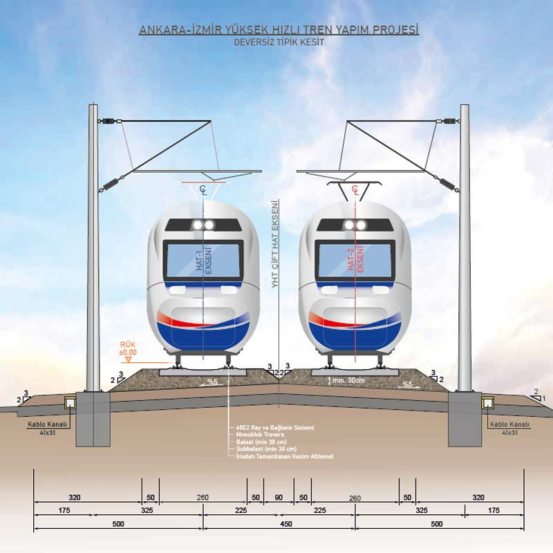 İlki Ankara-İzmir Yüksek Hızlı Tren (YHT) projesi. Ulaştırma ve Altyapı Bakanlığı, Ankara-İzmir arasını 824 kilometreden 624 kilometreye indirecek; karayolu ile 7 saat, demiryolu ile 14 saatlik seyahat süresini ise 3.5 saate düşürecek projede hattın bu yıl sonuna kadar Afyonkarahisar’a ulaşacağını, 2027 yılı sonunda ise İzmir’e kadar tamamlanarak faaliyete geçeceğini açıkladı.