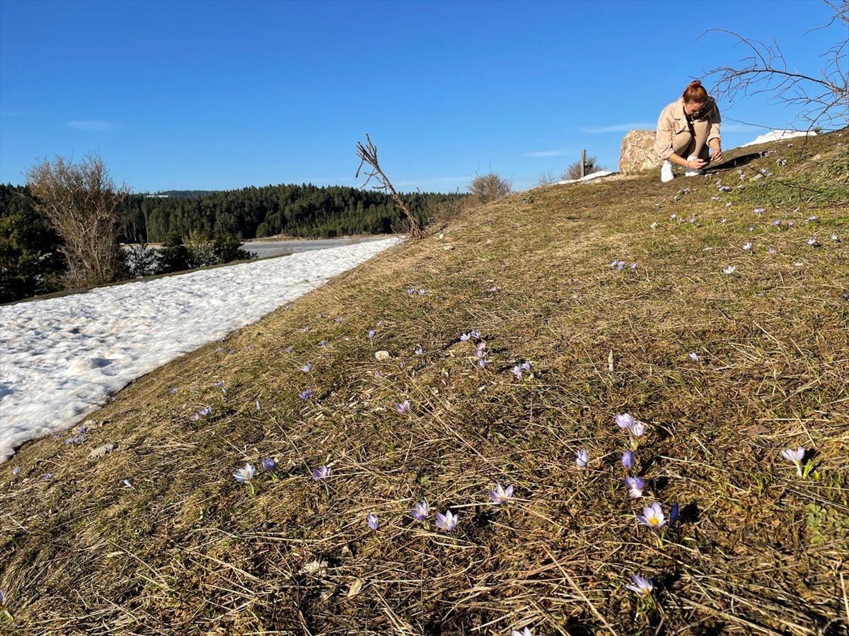 Karların eridiği alanlarda Abant'taki sarı ve mor çiğdemler çiçek açtı.