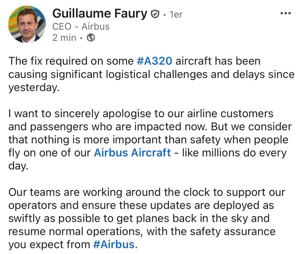 Faury, LinkedIn üzerinden paylaştığı mesajında “Etkilenen havayolu müşterilerimizden ve yolculardan içtenlikle özür diliyorum” ifadelerini kullandı.
