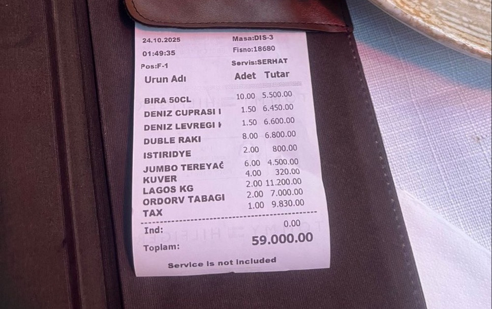 Almanya'dan İstanbul'a Fenerbahçe maçını izlemek için gelen dört turist, balık yemek için gittikleri restoranda 59 bin lira hesap ödedi. Sosyal medyadaki tepkilerin ardından Ticaret Bakanlığı ekipleri restoranda denetim yaptı. Denetimde fiyat listesiyle turistlerin ödediği tutar arasında aykırılıklar tespit edildi. Yapılan incelemenin ardından restoran ile ilgili işlem yapılacağı öğrenildi. İşletme sahibi Mahsum Çakır, "4-5 kişi restoranıma yemek yemeye geldi. Bizim menümüzde fiyatlarımız tek tek yazıyor. Biz her şeye açığız. Herhangi bir haksızlık söz konusu değildir" dedi.