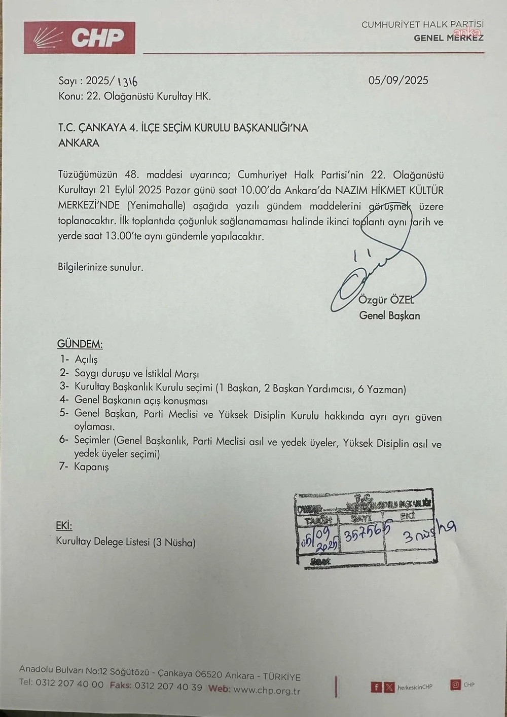 Tüzükte öngörülen yeterli sayıda imzalı başvurunun CHP Genel Merkezi'ne ulaşmasının ardından Genel Başkan Özgür Özel'in imzasıyla Çankaya 4. İlçe Seçim Kurulu'na yapılan başvuruyla 22. Olağanüstü Kurultay'ın 21 Eylül Pazar günü saat 10'da Ankara Nazım Hikmet Kültür Merkezi'nde toplanacağı ilan edildi.