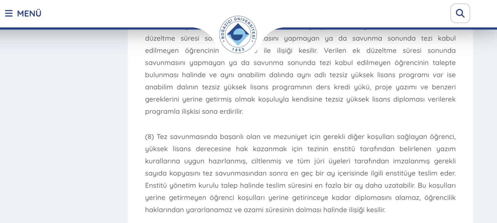 Boğaziçi Üniversitesi’nde tez süreci, öğrencinin jüri önünde yaptığı sözlü savunmayı başarıyla geçmesinin ardından işliyor. Savunma sonrası öğrenciye bir aylık süre tanınıyor; bu sürede jüri üyelerinin işaret ettiği düzeltmeler yapılıyor, imzalar toplanıyor ve tez, enstitüye teslim ediliyor.