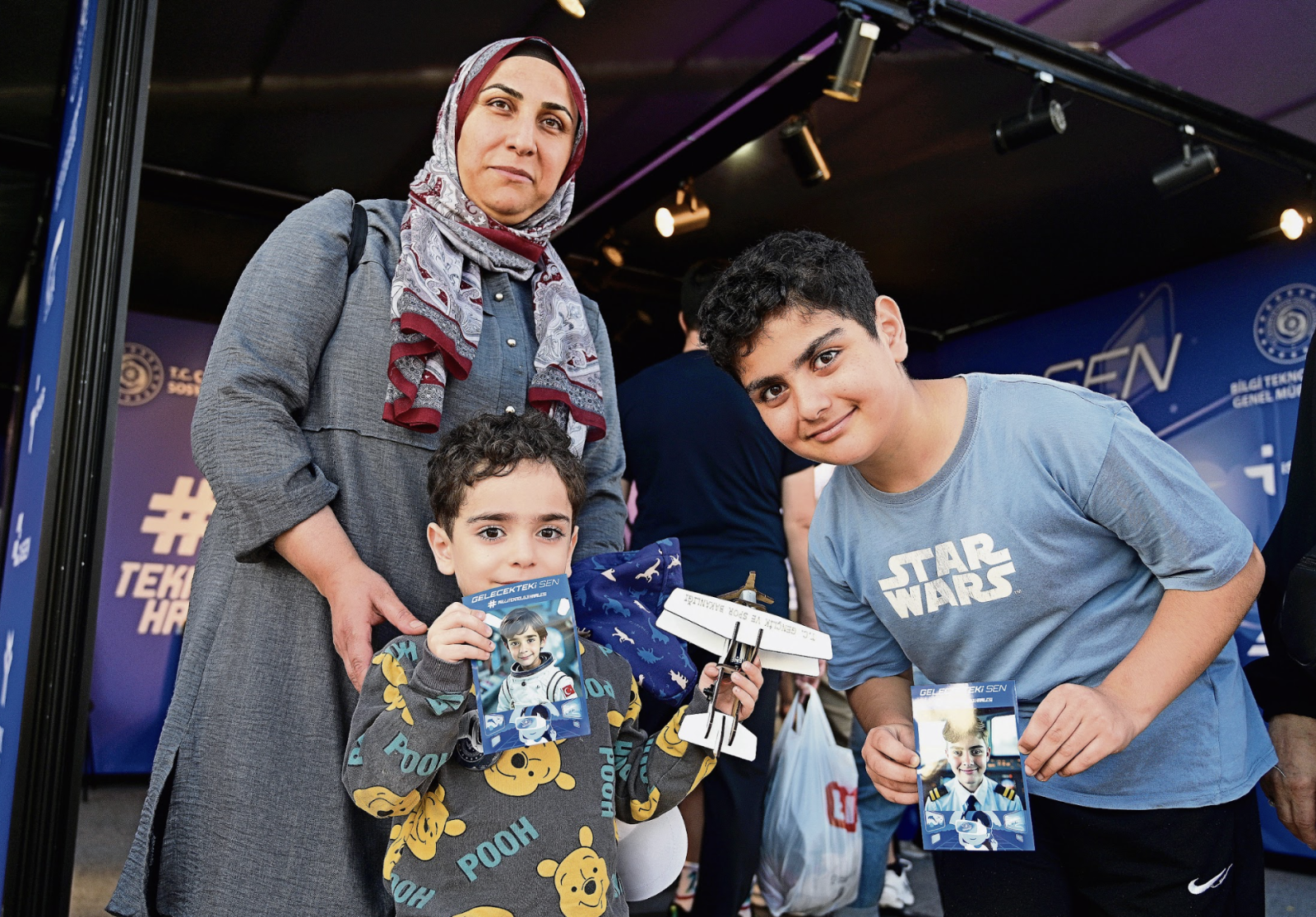 Sanayi ve Teknoloji Bakanlığı’nın bölümünde çok hoş bir uygulama var. İsmi ‘Gelecekteki Sen.’ On meslek belirlenmiş, çocuklar o meslekten birini seçip bilgisayar ekranına bakıp poz veriyor. Ve yapay zekayla biraz yaşlandırılmış halleriyle bir fotoğrafları basılıyor. Doktor mu doktor kıyafetiyle, itfaiyeci mi itfaiyeci kıyafetiyle... Çocuklar bu bölüme bayılıyor. Her biri elinde bir fotoğraf, mutlu mesut çıkıyor dışarı... O çocukların arasında Zeytinburnu’ndan gelen 12 yaşındaki Yusuf ve üç yaşındaki kardeşi Berat da var. Yusuf’un elinde pilot fotoğrafı, Berat’ın elinde ise astronot fotoğrafı...Anneleri Meryem Hanım çok gururlu.