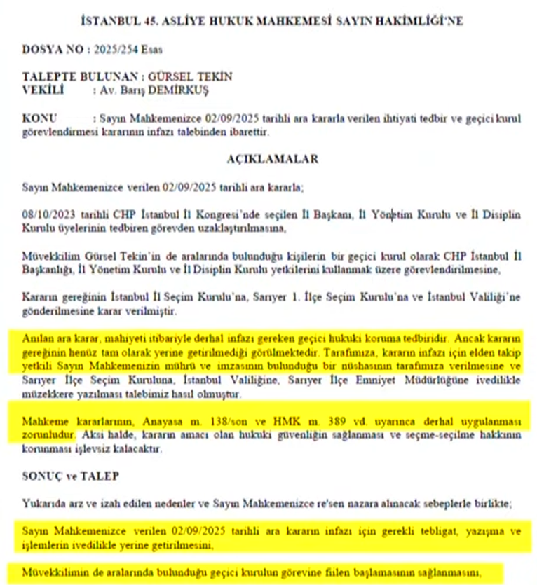 CHP İstanbul İl Başkanlığı'na kayyum olarak atanan Gürsel Tekin, 'Görevi yerine getirebilmem için kararın örneğini bana da verin" ifadelerini kullanarak mahkemeye başvurdu. Mahkeme başvurusunun bugün tarihli olması dikkat çekti.