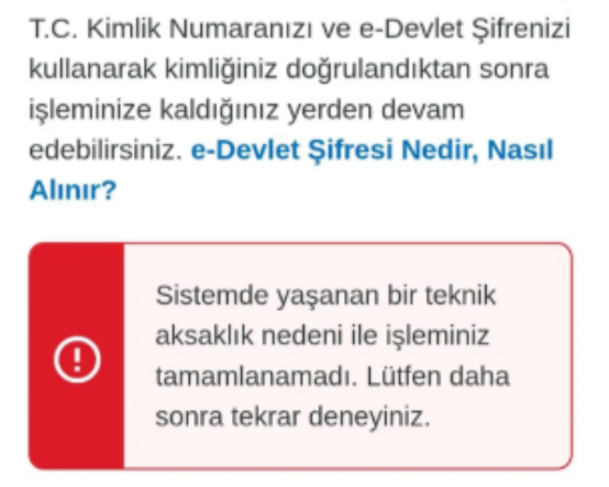 İlk gün yoğun talep nedeniyle kimlik doğrulama ekranında “Sistemde yaşanan teknik aksaklık” uyarısı görülebiliyor. Bu hata çoğunlukla anlık trafik, oturum zaman aşımı ve servis cevap sürelerinin uzamasından kaynaklanıyor.