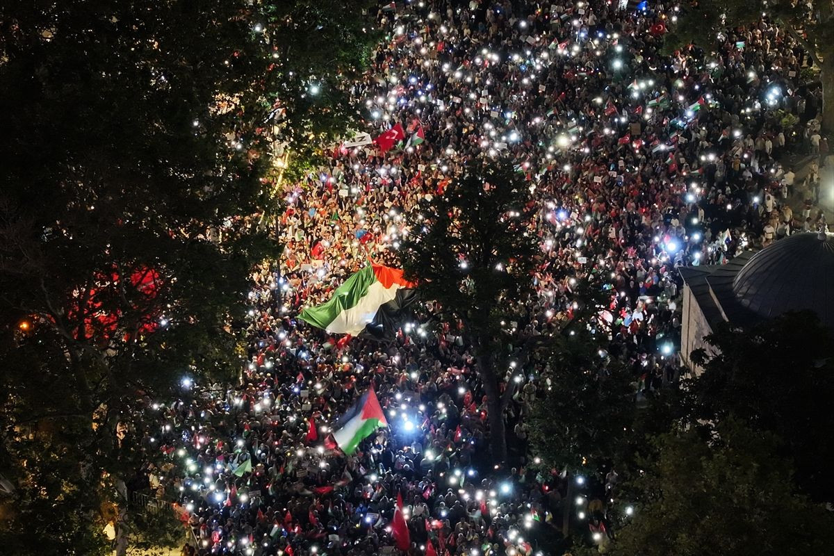 Etkinlikte konuşan Filistin'e Destek Platformu Dönem Başkanı Mehmet Güney, tarihi bir gece olduğunu ifade ederek, Beyazıt Meydanı'ndan Ayasofya'ya kadar tekbirler ve dualarla yürüdüklerini söyledi. Güney, "İnşallah bu yürüyüşümüz Gazzeli mücahit kardeşlerimize umut olsun istiyoruz. Bu umut öyle bir diri umut olsun ki mücahitlerin yüreğini, imanını güçlendirsin, Tel Aviv'deki kepazelere de korku olsun inşallah." dedi.