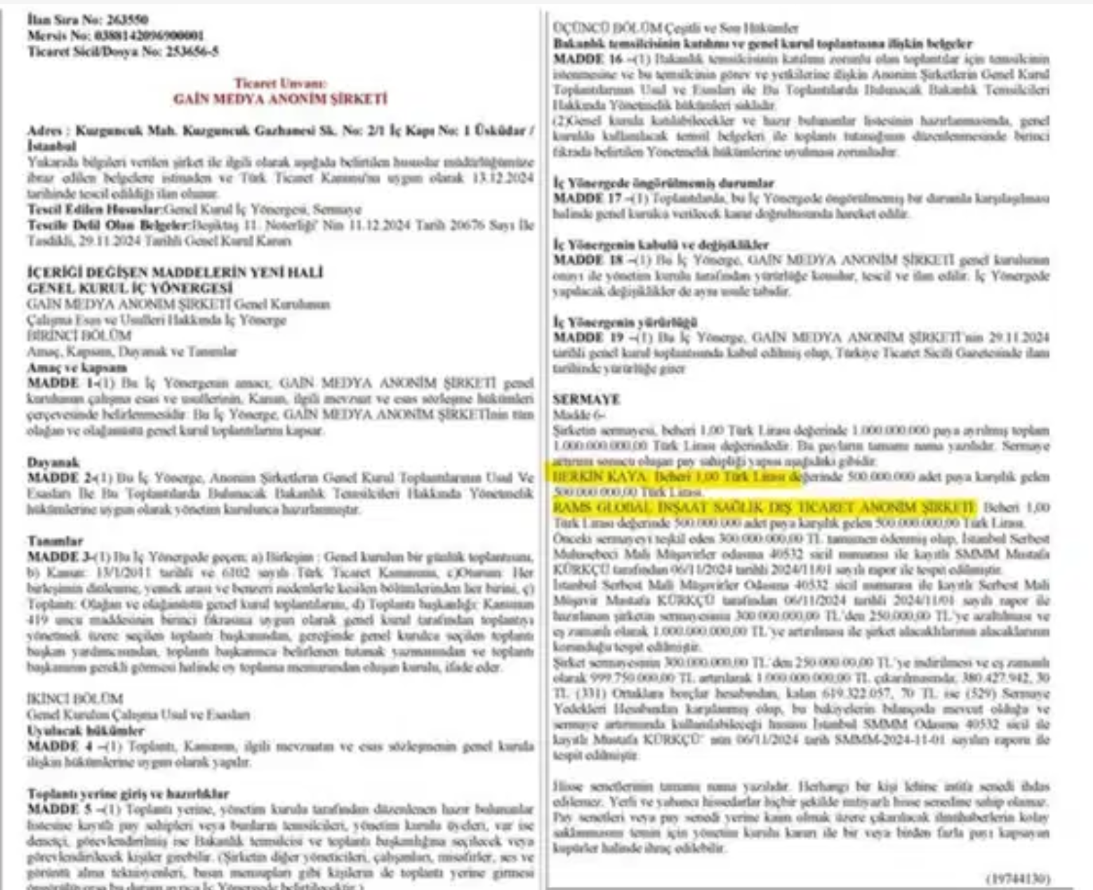 MASAK raporları, bilirkişi raporları, gizli tanık beyanları, iletişimin tespitine ilişkin tutanaklar, ticaret sicil kayıtları ve açık kaynak araştırmaları doğrultusunda yapılan incelemelerde; 09/07/2020 tarihinde kurulan GAİN Medya Anonim Şirketi’nin %50 hissesinin 11/06/2024 tarihinde şüpheli Berkin KAYA tarafından devralındığı, bu devir öncesi ve sonrasında 19/04/2024–22/10/2024 tarihleri arasında