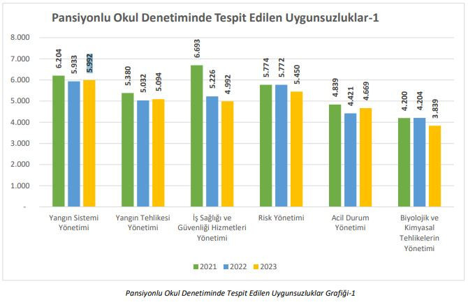 MEB'e bağlı Merkez İşyeri Sağlık ve Güvenlik Birimi'nin 01.04.2024'te yayımladığı 2023 Yılı Sağlık ve Güvenlik Hizmetleri Değerlendirme Raporu, okul pansiyonlarındaki usulsüzlüklerin türlerine göre dağılımını ortaya koyuyor. Denetimlerde en çok tespit edilen uygunsuzluğun, 5 bin 992 uygunsuzluk ile yangın sistemi yönetimi ile ilgili olduğu belirlendi. Yangın tehlikesi yönetimi ise 5 bin 94 uygunsuzluk tespiti ile ikinci sırada yer aldı. MEB’e bağlı iş sağlığı ve güvenliği ekipleri, “İş Sağlığı ve Güvenliği Hizmetleri Yönetimi” başlığı altında ise okul pansiyonlarında, toplam 4 bin 992 uygunsuzluk yakaladı.