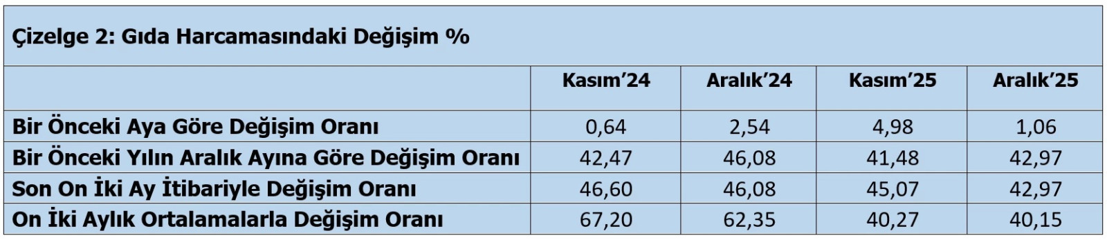 TÜRK-İŞ verilerine göre "mutfak enflasyonu", Aralık 2025’te aylık yüzde 1,06 olarak hesaplandı. Gıda harcamalarındaki artışın 12 aylık değişim oranı yüzde 42,97 olurken, yıllık ortalama artış yüzde 40,15 olarak gerçekleşti.