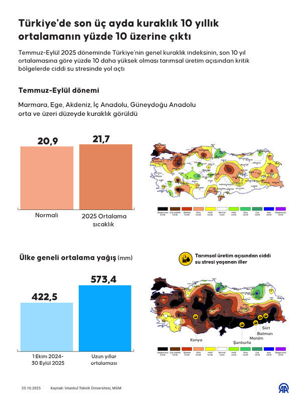 İstanbul Teknik Üniversitesi Uçak ve Uzay Bilimleri Fakültesi İklim Bilimi ve Meteoroloji Mühendisliği Bölümü Öğretim Üyesi Prof. Dr. Mikdat Kadıoğlu, Temmuz-Eylül 2025 döneminde Türkiye'nin genel kuraklık indeksinin, son 10 yıl ortalamasına göre yaklaşık yüzde 10 daha kurak seyrettiğini belirterek, "Özellikle Konya, Şanlıurfa, Mardin, Batman ve Siirt gibi tarımsal üretim açısından kritik bölgelerde ciddi su stresi yaşandı" dedi. Meteoroloji Genel Müdürlüğünün (MGM) Standartlaştırılmış Yağış İndeksi (SPI) 2025 Eylül ayı meteorolojik kuraklık durumu haritaları yayımlandı.