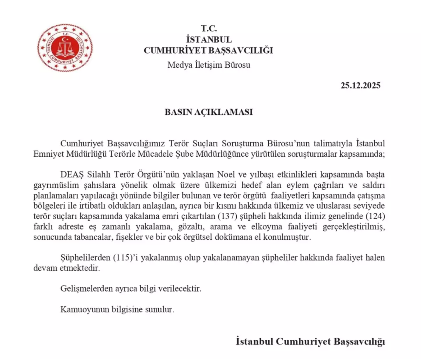 DEAŞ silahlı terör örgütünün yaklaşan Noel ve yılbaşı etkinlikleri kapsamında başta gayrimüslim şahıslara yönelik olmak üzere ülkemizi hedef alan eylem çağrıları ve saldırı planlamaları yapılacağı yönünde bilgiler bulunan ve terör örgütü faaliyetleri kapsamında çatışma bölgeleri ile irtibatlı olduktan anlaşılan, ayrıca bir kısmı hakkında ülkemiz ve uluslarası seviyede terör suçları kapsamında yakalama emri çıkartılan 137 şüpheli hakkında ilimiz genelinde 124 farklı adreste eş zamanlı yakalama, gözaltı, arama ve elkoyma faaliyeti gerçekleştirilmiş, sonucunda tabancalar, fışekler ve bir çok örgütsel dokümana el konulmuştur.