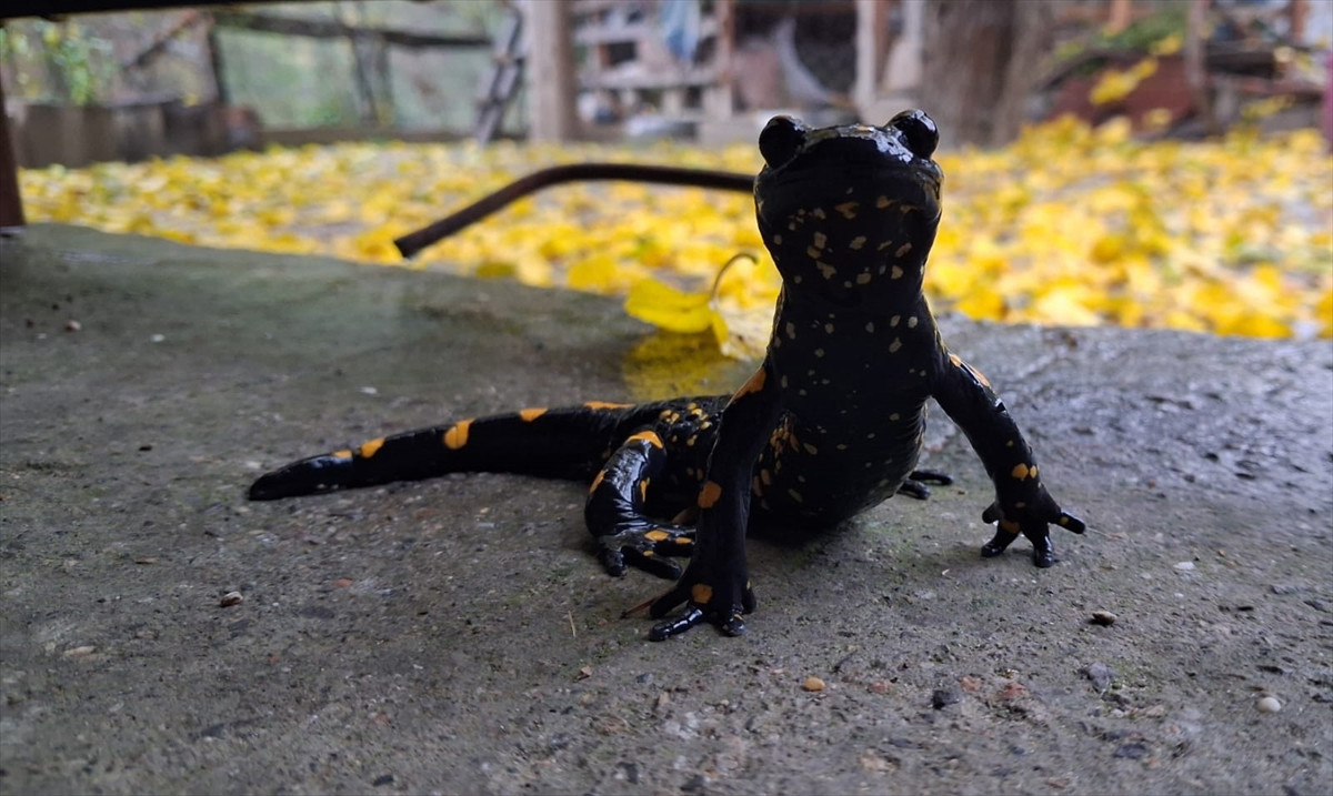 Nesli tükenme tehlikesi altında olduğu için öncelikli korunan türlerden olan sarı benekli semender, bir süre evin çevresinde dolaştıktan sonra bölgeden uzaklaştı.