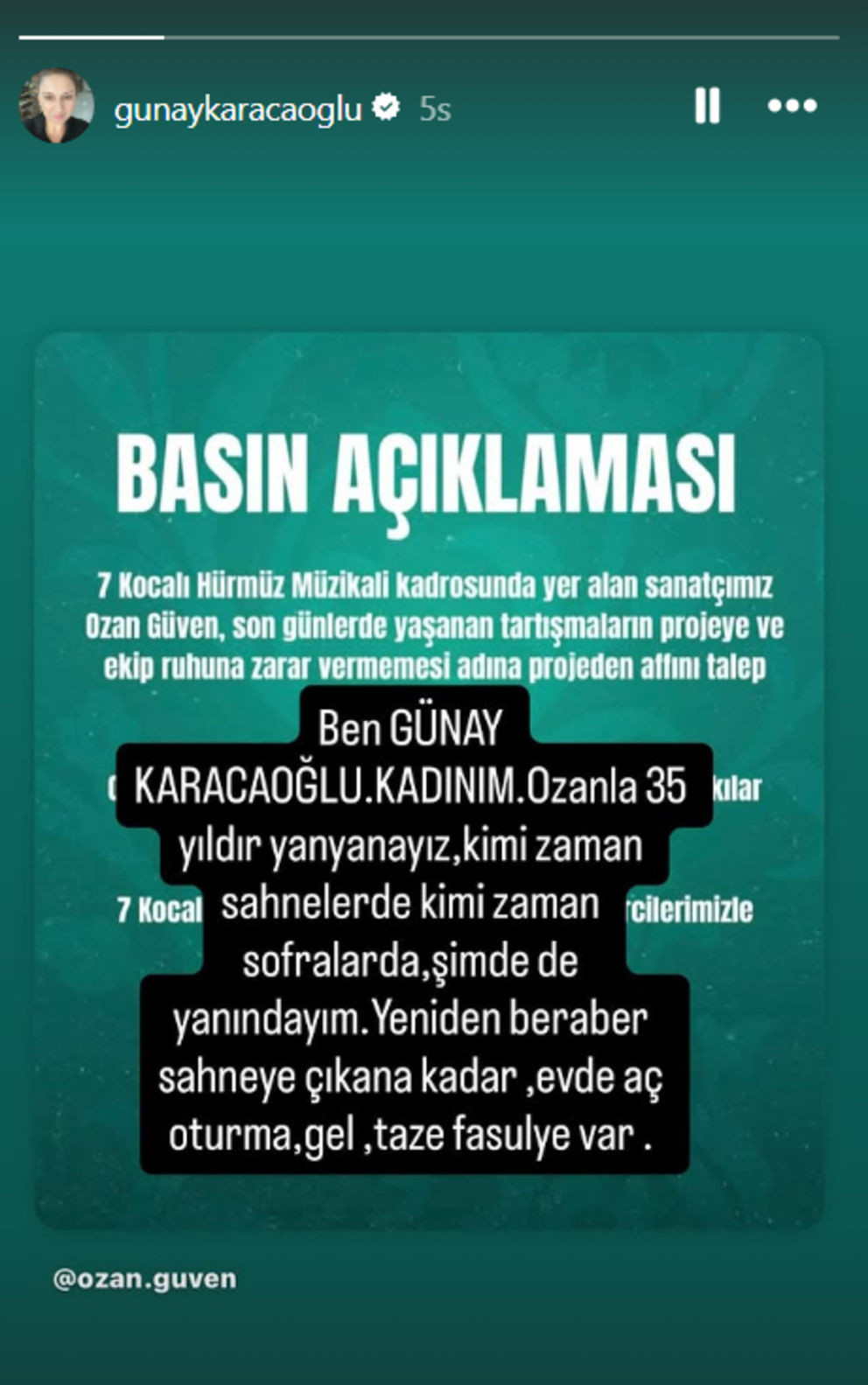 Tiyatro ve dizi oyuncusu Günay Karacaoğlu, '7 Kocalı Hürmüz' müzikalinden ayrılan ünlü oyuncu Ozan Güven'e, "Ozan ile 35 yıldır yan yanayız; kimi zaman sahnelerde, kimi zaman sofralarda. Şimdi de yanındayım. Yeniden beraber sahneye çıkana kadar evde aç oturma, gel; taze fasulye var" ifadeleriyle destek mesajı paylaştı.