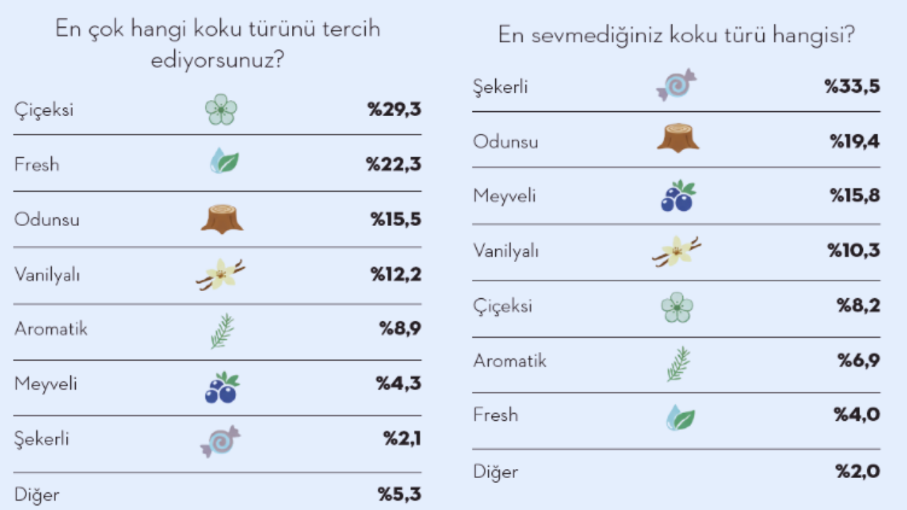 Araştırmaya göre, tüketicilerinin en çok tercih ettiği koku türü çiçeksi kokular oldu. Katılımcıların yüzde 29,3’ü bu kokuları seçerken, ikinci sırada yüzde 22,3 ile fresh (ferah) kokular yer aldı., Buna karşılık, şekerli kokular yüzde 2,1 ve meyveli kokular yüzde 4,3 ile en az tercih edilen türler arasında bulundu.