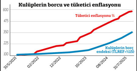 Kulüplerin 2021 Mayıs sonunda yani sözleşmenin devreye girdiği tarihte 100 lira başlangıç değerinde olan borçları 30 Temmuz 2025’e geldiğimizde biriken faizlerle 348 liraya yükselmişti. Oysa o günden bu yana TÜİK’in hesapladığı tüketici enflasyon hesabına göre 100 liralık mal veya hizmetin değeri 583 liraya yükselmişti. Bu borçların enflasyona karşı reel olarak %40 azalması anlamına geliyor.