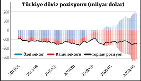 2018’de 50 milyar dolar döviz riski taşıyan kamunun 2023 ortasında bu riski 350 milyar dolara yaklaştı. Özel sektör ise 100 milyar dolar açıktan 200 milyar dolar fazlaya geçti. Meşhur 128 milyar dolarlık rezerv satışı düzeneği şirketlerin ve yabancı yatırımcıların uygun fiyattan döviz satın almasını sağladı.