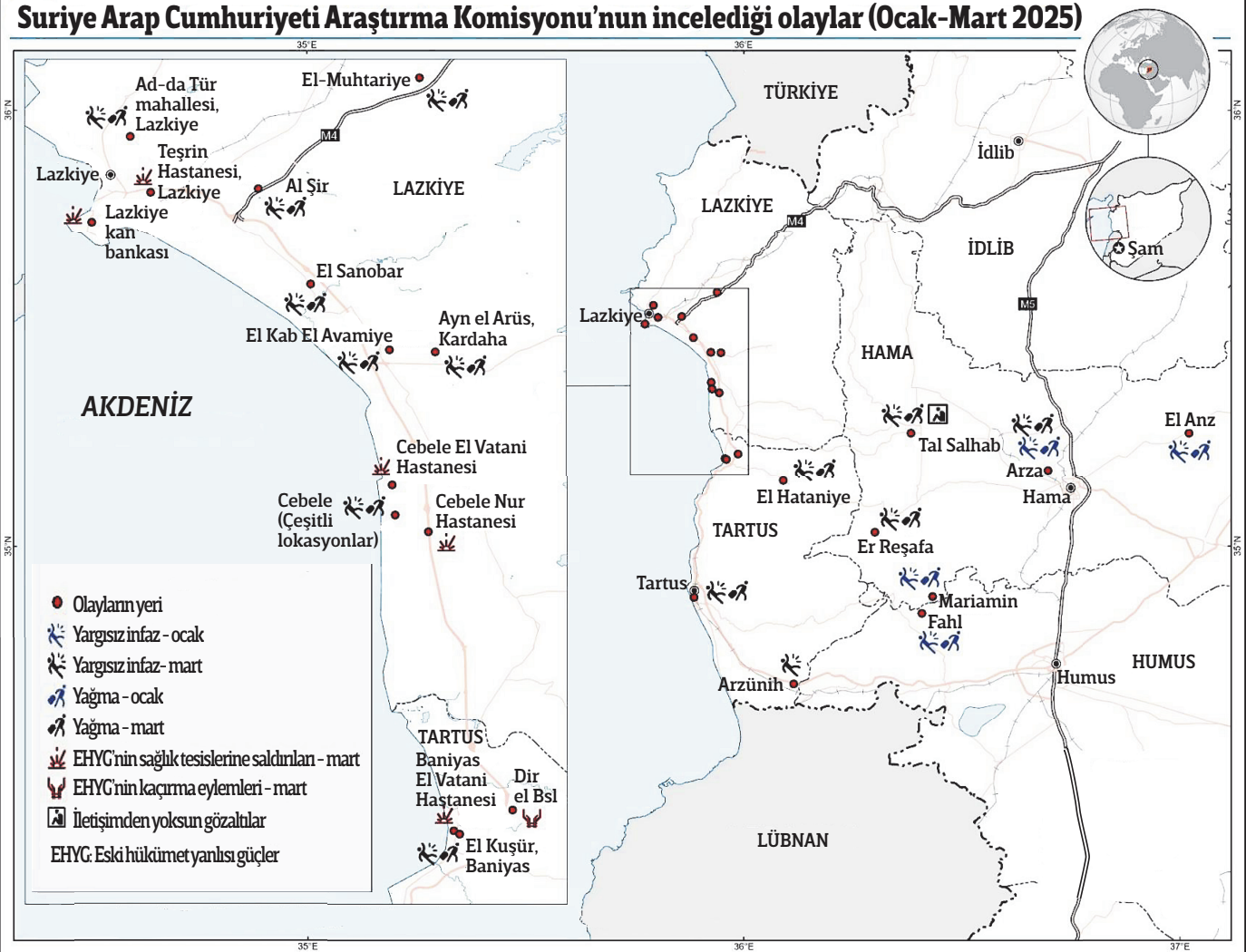“Tanıklara göre, 6 Mart akşamı ve 7 Mart’ın erken saatlerinde Hama, Humus, Lazkiye, Banyas, Ceble ve Halep dahil olmak üzere birçok şehirde sosyal medya üzerinden ve yerel camilerden hoparlörlerle yapılan anonslarla geniş çaplı dini seferberlik ve “Nefir-i amm” (savaşa katılma) çağrıları yayılmıştır. Mezhepçi söylemlerle yüklü bu çağrıların, genel olarak Alevi nüfusu hedef aldığı ve birçok kişi tarafından geleneksel bir askeri seferberlik çağrısından ziyade, derhal harekete geçmeyi gerektiren dini bir seferberlik çağrısı olarak anlaşıldığı görülmüştür.”