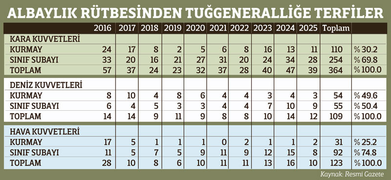 Genel bir toplam alındığında geçen 10 yıl içinde her üç kuvvette generalliğe yükselen toplam 596 askerin yüzde 32.7’si kurmay, buna karşılık yüzde 67.3’ü sınıf subayı kökenlidir.