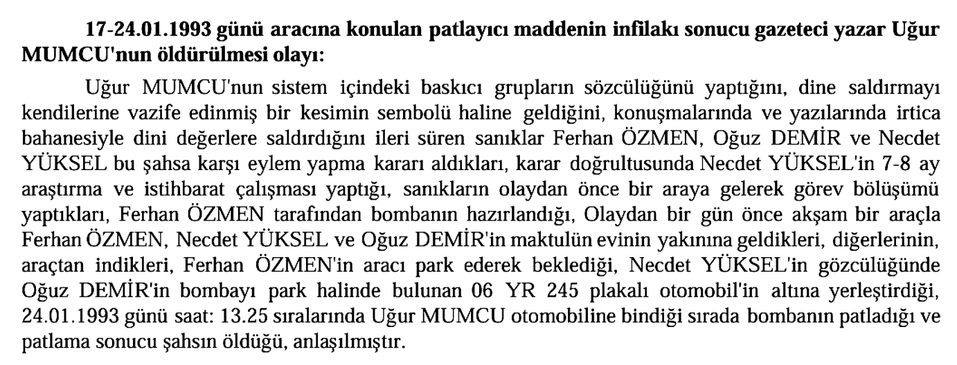 Buna göre, Uğur Mumcu’nun öldürüldüğü eylemi Ferhan Özmen, Oğuz Demir ve Necdet Yüksel birlikte planlamış ve icra etmiştir. Özmen bombayı hazırlamış, Necdet Yüksel gözcülük yaparken Oğuz Demir bombayı park halindeki 06 YR 245 plakalı araca yerleştirmiştir. Bomba, Uğur Mumcu 13.25’te otomobile bindiği sırada patlatılmıştır.