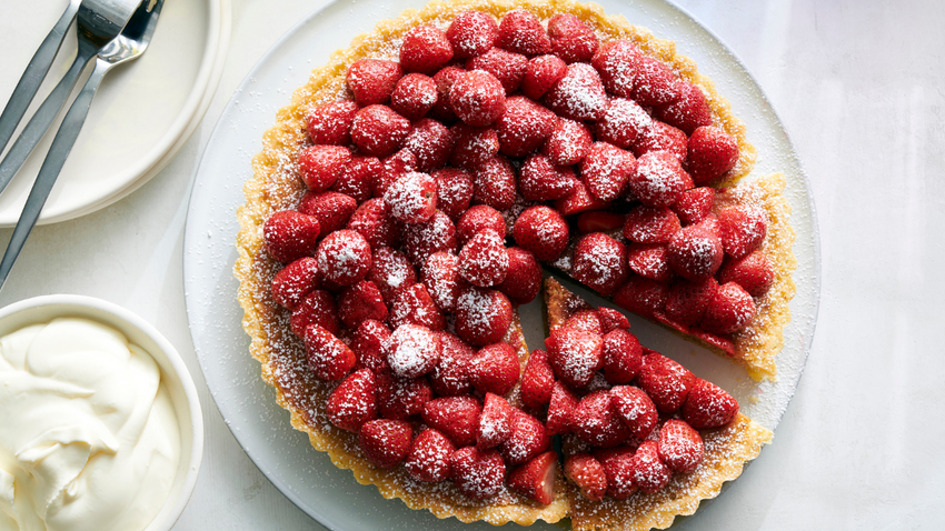 - Tart kalıbının dış çerçevesini çıkarın ancak metal taban üzerinde bırakın. Tartı servis tabağına alın.