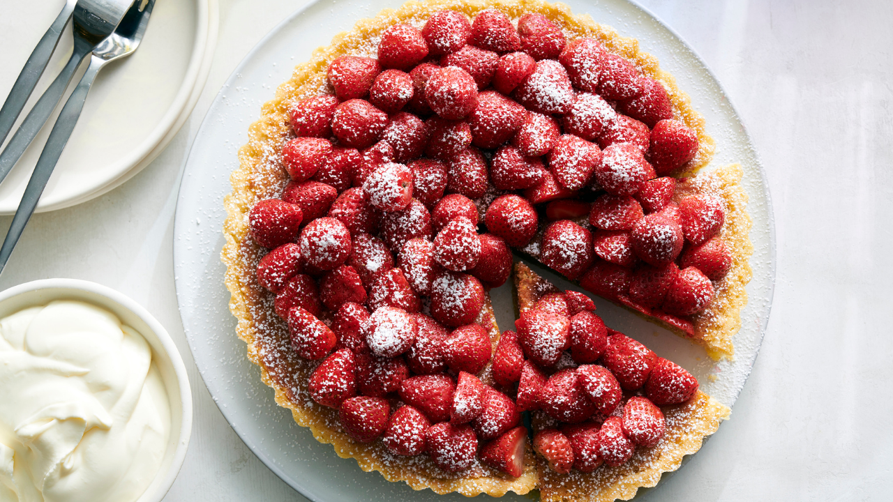 - Bütün ya da ikiye bölünmüş çilekleri tartın üzerine dizin.