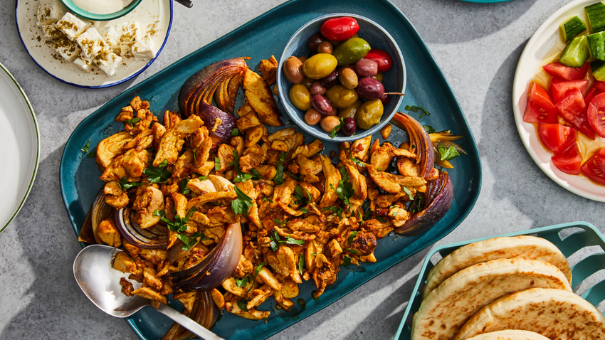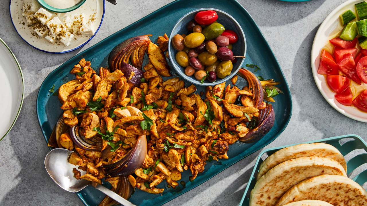 - Pişirmeye hazır olduğunuzda fırını 220 dereceye ısıtın. Kenarlı bir fırın tepsisini kalan 1 yemek kaşığı zeytinyağıyla yağlayın. Dörde bölünmüş soğanı tavuk ve marine karışımına ekleyip bir kez karıştırın. Tavuğu ve soğanı marinattan çıkarıp tepsiye eşit şekilde yayın.